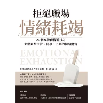 職場情緒耗竭是新興的議題。百大頂級企業CEO御用顧問張敏敏,累積在台灣本土廠商、法商、美商、日商等擔任管理職的經驗,在這本書中根據最常引發的三類情緒問題來源:上司、同事、下屬,揉合學術、實務,提供24個職場應對技巧,有步驟、有方法,甚至有話術,明確地幫助你應付在「向上溝通」、「同儕互動」、「向下管理」容易糾結的種種狀況。