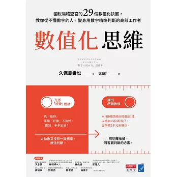 數值化思維是各行業職場都需要具備的基礎能力,且愈是高效工作者,愈需要透過數字抽絲剝繭,明快找到可行途徑。別再說自己對數字不靈光、我的強項是文科了!透過本書,你也可重拾數字自信且透過生活與工作的實踐培養它。──黃昭瑛(KKday營銷長 )