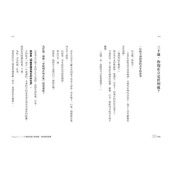 30歲的你,可以成為「人脈富翁」,為自己奠定穩定踏實的基礎;30歲的你,思考尚未僵化,可以拋棄固執和成見,突破自己的極限;30歲的你,擁有足夠的氣量,能夠接受社會現實,並讓自己的心變得更強大。30歲的你充滿變化,但這些變化都會是「進化」。