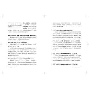 作者把本書架構得很好,可以做為職涯中,持續溫故知新的好朋友,……,只要你從事產品開發的相關工作,就需要在每個不同的時期,以不同的角度來回顧一下過去所走過路,到底是走對了,還是走偏了,未來的路又該怎麼來修正,你將因此得到巨大的成長。──盧鄭麟,專案管理與敏捷方法專業講師、PROJECT UP 專欄作家