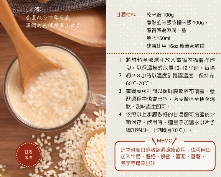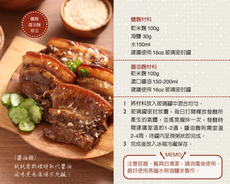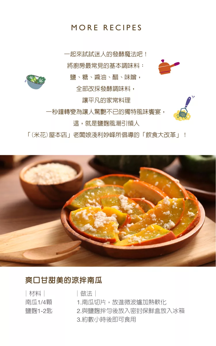 鹽以「鹽麴」取代,糖以「甘酒」取代,全部改採發酵調味料,