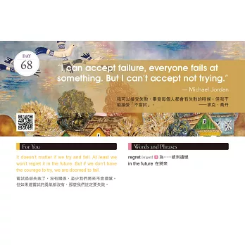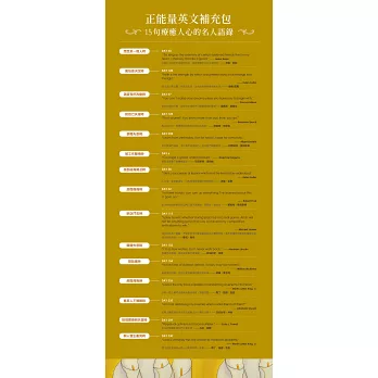 收錄120位名人語錄,包括J. K. Rowling(J. K. 羅琳)、Michael Jordan(麥克•喬丹)、Steve Jobs(史蒂夫•賈伯斯)、Barack Obama(巴拉克•歐巴馬)、Mother Teresa(德雷莎修女)……等全球知名人士的勵志名言。