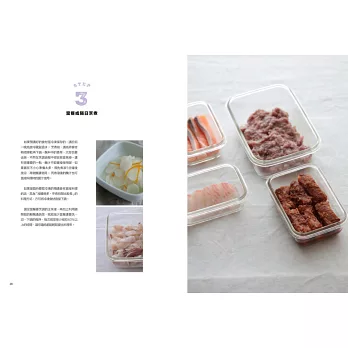 ●Step1處理主食材與預漬→●Step2冷藏或冷凍保存→●Step3當餐加上配料做變化