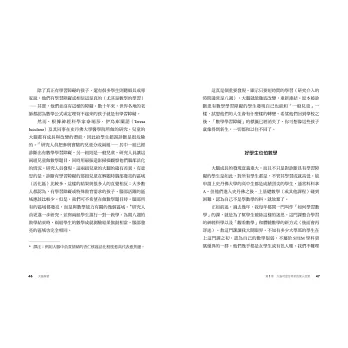 .在數學教育現場,最大的困難是矯正學生(有時也有家長)對數學學習的迷思。本書許多內容就是針對數學的學習與教學的探討與改進,除了對老師與學生的訪談與實證,也有腦神經在生理上的印證。值得閱讀並深思的一本書。──任維勇,北一女中數學科教師