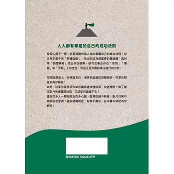 每個人都不一樣,好葉鼓勵每個人找出專屬自己的成功法則!你可用本書中的「葬禮遊戲」,找出你認為最重要的價值觀;再利用「刺蝟策略」找出你的優勢,便可交集出你在「熱情」「價值」和「天賦」上的定位,而這正是你應該專注進行的方向。
