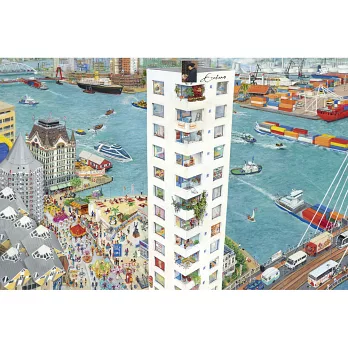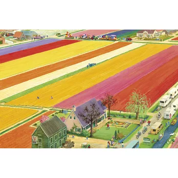 夏洛特‧迪瑪頓斯花了三年時間,以二十七個跨頁,繪出荷蘭四季的風景。她讓歷史人物、名畫、童書角色走入了現代的場景,你會發現,十七世紀的名畫家林布蘭站在當今阿姆斯特丹的街道上,東印度公司的商船和現代觀光渡輪在同一片海上航行,沙灘上有米飛兔,戴珍珠耳環的少女在看板上回眸!