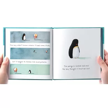奧利佛.傑法把男孩與企鵝之間「不離不棄」的深厚情誼及其成長經驗故事,用他擅長的淡彩渲染,溫柔營造故事氛圍; 質樸又具童趣的線條勾勒和大量留白畫面,能將那些無以名狀的情感:失去/獲得、擁有/分享、分離/相聚等,在小小的嘆息中,娓娓道來。他的一張圖往往抵過千言萬語,每個故事都令人動心。