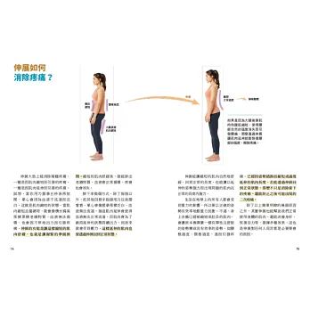 本書伸展分為兩個部分,第一為「靜態伸展」透過反覆只做一動作,調整強度,就像讓長期僵硬縮短的肌肉慢慢伸長,第二為「動態伸展」會讓目標肌群收縮或舒緩,避免肌肉間互相刺激帶來壓力。兩種伸展是互補的、加成的,若順序顛倒,就可能會因為原本縮短的肌肉無法延伸而再次陷入疼痛的深淵。