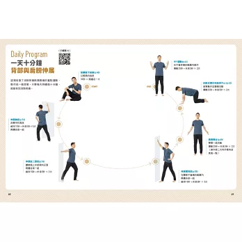 本書附有作者親自示範的影片QRCODE以方便讀者在家就能隨時跟著做,除了每個動作的詳細解說示範之外,還分為五大痠痛部分的「一天十分鐘伸展動作」,可作為每日保養維持肌肉彈性的簡單運動,有效終結痠痛。