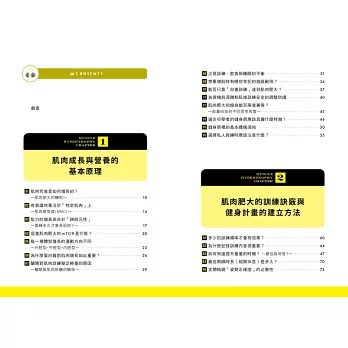 如果只是盲目地模仿他人的動作,你的肌肉訓練終將無法獲得滿意的成果。而無論年紀多大,只要擁有正確的知識並適當地持續訓練,肌肉一定會增長。這本書不僅僅是介紹常見的運動,本書撰寫的目的,是為了讓讀者學習以科學為依據的肌肉生長「理論」。簡言之,本書可說是聚焦於肌肉肥大的「肌肉訓練教科書」。