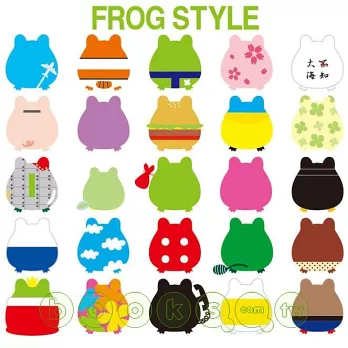 每隻「FROG STYLE百變蛙」的身型大小相同,但表情面貌都大大不同,代表的意義也不一樣。每一隻青蛙都有自己的名字、棲息地、個性、愛的訊息(一段鼓勵人心的話語),以及最適合贈送的對象……牠們至今已累積了300多款不同的造型。無論是什麼樣的人,都可以在裡面找到一個最能夠代表自己個性的專屬青蛙。