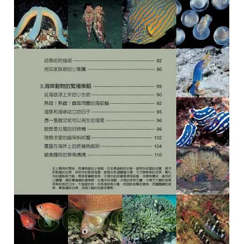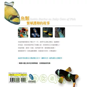本書由日本東海大學名譽教授鈴木克美所撰寫,內容描述魚類育幼的各種生殖策略與行為故事。作者以輕鬆平易的口吻訴說海洋生物的奧妙,並與小林安雅搭配精美珍貴的魚類世界照片帶一同你探索海洋魚類的秘密,讓你享受宛如觀賞一部生態影片般的知性之旅。