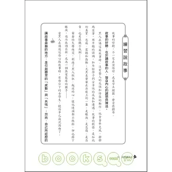 每則故事內容,都具有十足的可讀性,但最重要的是戴晨志老師利用這些故事,一一闡述如何運用語氣、表情、肢體動作,讓故事具有情感凝聚力、產生想像空間,感動聆聽者。