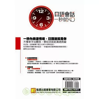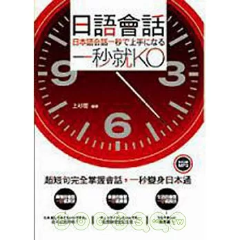 《日語會話,一秒就KO》貼近各種日常生活情境,將內容分為購物、旅遊、生活三大類,從此想到什麼就說什麼,關鍵時刻也能和日本人暢所欲言的溝通。一次網羅大小事,和日本人應對不會再錯用短語。