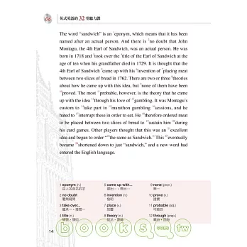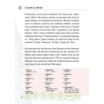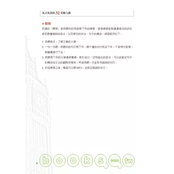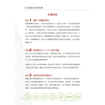 全書32篇文章,從最能代表英國的飲食、體育、到聞名全球的文學名著、電影人物等,皆以中級程度的英文詞彙所編寫。除可提升「聽力」,也是增進「讀寫」及「口說」的最佳教材。讀者可依照下列的學習目標,選擇使用MP3的學習方式。