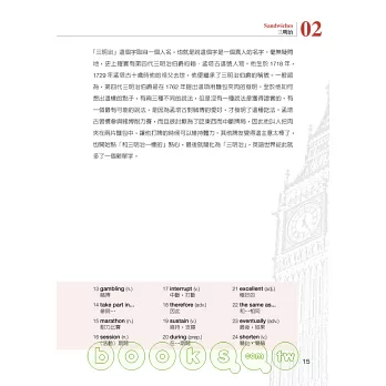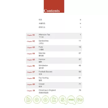 豐富多樣的英國傳統與文化,於各章中皆有說明敘述。在學習英式英語的同時,還可以了解英國的傳統與文化,有大家所熟知的披頭四、溫布頓、007等相關內容,也有英國人對園藝、美術、動物保護的想法。這不僅增添了學習英語的樂趣,也能夠讓讀者獲得與語言有關的背景知識。