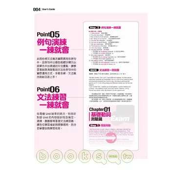 朗誦口訣一唸就會:每個核心文法都附上一段易背易懂的有趣口訣,讓你用最容易記憶的句子理解原本枯燥艱澀的文法觀念!Ex:be動詞,很easy。否定句後面加個not,疑問句搬到句首大寫就可以!