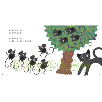 故事從有一條尾巴和兩隻眼睛的貓開始,牠被掉下來的三個芒果打到,只好拔起四條腿就逃,路上又遇到五棵樹倒下來……經過一路的奔波,貓咪碰到了一窩老鼠:五隻老鼠爬上樹、五隻老鼠在樹下跳舞,數一數、算一算,總共有幾隻小老鼠?
