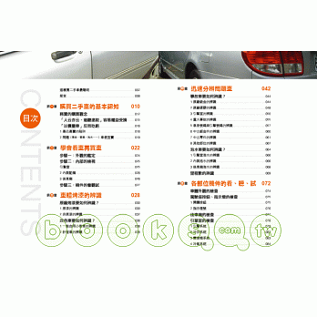 ◎購車管道、點交時需注意的表單與物件、如何投保汽車保險、貸款利率換算例……等讀者想要知道的事項一應俱全,皆有收錄