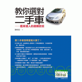 《教你選對二手車》將會解決你的所有困擾:作者從務實的購車觀念開始談起,強調消費者一定要有「一分錢一分貨」的心理準備,切忌貪小便宜,看到低價就什麼都忘了;再來就購車管道、外觀與內部的鑑定撇步、各部位的看聽試、購車需準備的證件與事宜、各種常見Q&A等一一介紹,更提供實際照片與清楚圖解輔助說明過程,讓買賣二手車的「眉眉角角」完全呈現,只要照著書中提供的辨識技巧實際操作,再怎麼「搞怪」的車子也逃不了銳眼。