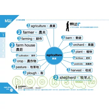 2. 利用「心智圖法」(即本書中的「Word Map單字地圖」),強化大腦記憶-心智圖法是讓許多單字產生關係的一種呈現方式。根據調查研究,這樣的呈現方式有助於大腦「記住」與「回憶」。心智圖法通常用橫向的方式呈現,因為橫向被認為與多視覺掃瞄型態較相稱。換言之,它們比較容易被人閱讀與複習。