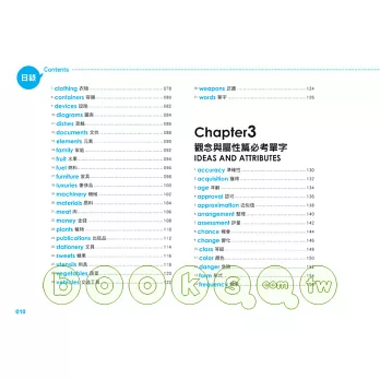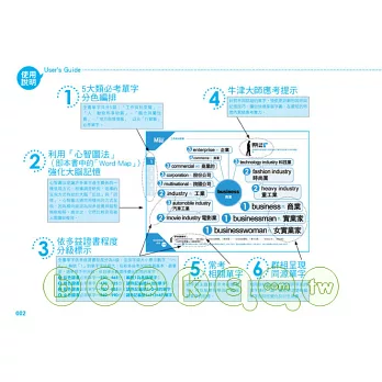3. 5大類常考單字分色編排-全書將單字分為5大類,分別收錄相關字群25~31組,每組皆以「單字地圖」的方式呈現13~15個關鍵單字,清楚明瞭,便於記憶。