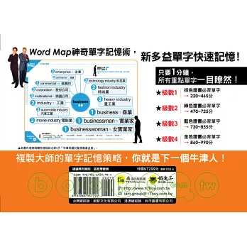 1. Word Map神奇單字記憶術-兩位牛津英語教學大師獨創的「Word Map」單字記憶法,利用圖像呈現新多益考試重點單字,中英對照、一目瞭然。