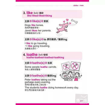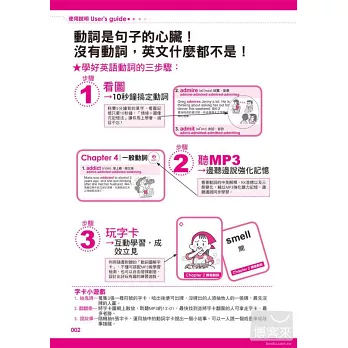 除了生動的圖片、動詞的中英文解釋、KK音標、三態變化,更補充常用句型,讓你背單字、記句型一次搞定。