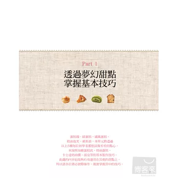 本書介紹53道百試不膩的人氣甜點,而為了使讀者在製作過程中一路通向美味的高峰,每道甜點的作法前都條列出注意事項,讀者只要動手前先閱讀就能夠避免失敗!除此之外,還附上製作過程的照片,強調出每個步驟的重點。即使是初次製作甜點的新手,也可以藉由本書確實掌握烘焙技巧,成功做出美味甜點。