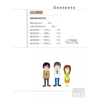 本書中包括了:對記憶的基礎認識、發掘自我記憶特質、調整改善記憶條件、各種增加腦部記憶效能的絕妙好招。