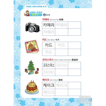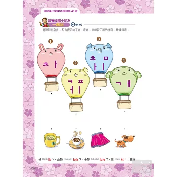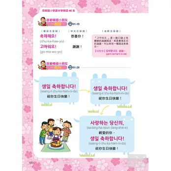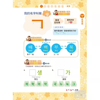 2. 該有的通通有:除了收錄韓語40音之母音、子音、尾音、組字規則之外,本書更結合韓語40音字音、單字、會話;聽、說、讀、寫,一應俱全!