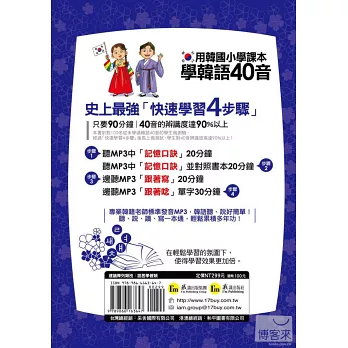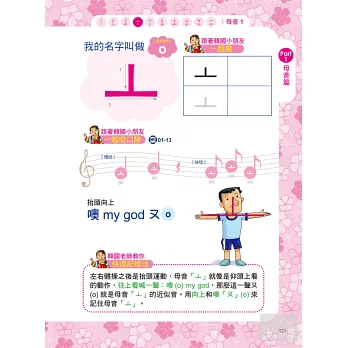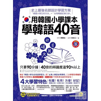 以韓國小學課本為基礎,台灣人學韓語的盲點為切入。用韓國小朋友常玩的繞口令、文字遊戲等,趣味化學習韓語基本發音,更貼近韓國人初學韓語的方式學習。並獨創最適合台灣人的方法,「直覺式」、「口訣式」、「圖像式」一次就把韓語40音牢牢記住。
