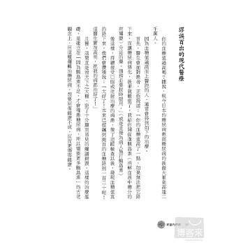 破除現代醫療謬論,強調健康醫:現代人對謬誤百出的醫療深信不疑,例如糖尿病注射胰島素,雖然表面看起來藥物令血糖降低了,但實際上卻是轉為內臟脂肪囤積在體內,引發新陳代謝症候群。作者指出,現代醫療應該是預防勝於治療,也就是不等到生病才著手治療,而是從一開始就不讓疾病有機可乘。