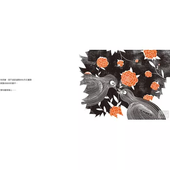 相異於大多數色彩繽紛的繪本,以版畫形式創作《傑布龍的紅氣球》,僅有最單純的紅、黑、白三色,以及簡單的點、線、面,構築出畫面的無窮趣味。