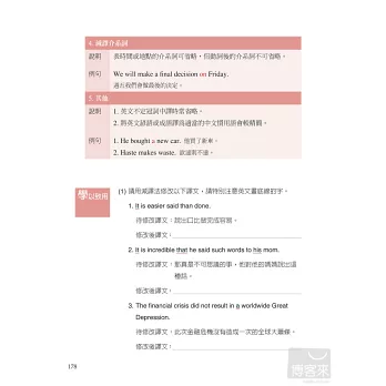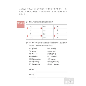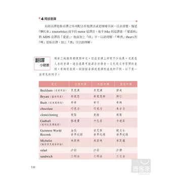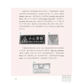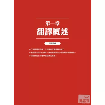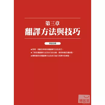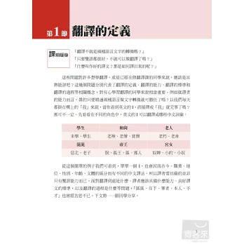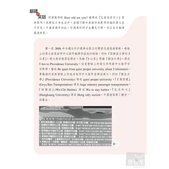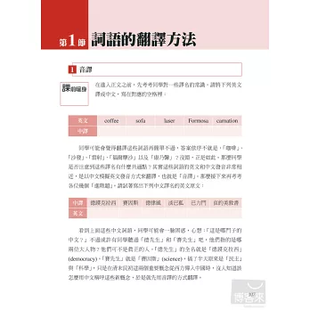 為了達到以上三大目標,本書煞費苦心設計了不同的單元,從課前暖身到課中、課後的練習,皆以最輕鬆易懂的方式講解,少用抽象術語,並且搭配大量生活化的例子與「翻譯鬧笑話」等單元,即使是自學者,也能透過本書逐步培養翻譯相關的知識和能力。