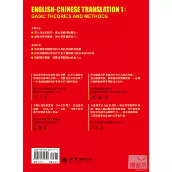 說明清楚,少用抽象術語,多用實例,搭配練習、笑話等單元,讓學習不枯燥乏味,在輕鬆的氣氛中奠定堅實的學術基礎,增進翻譯意識與翻譯能力。
