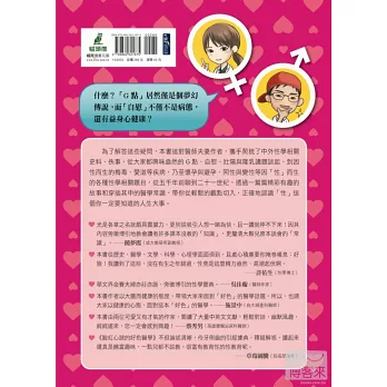 為了解答這些疑問,本書這對醫師夫妻作者,攜手爬梳了中外性學相關史料、佚事,從大家都興味盎然的G點、自慰、壯陽與隆乳議題談起,到因性而生的梅毒、愛滋等疾病,乃至懷孕與避孕、同性與變性等因「性」而生的各種性學相關題目,從五千年前聊到二十一世紀,透過一篇篇精彩有趣的故事和穿插其中的醫學常識,帶你從輕鬆的觀點切入,正確地認識「性」這個你一定要知道的人生大事。