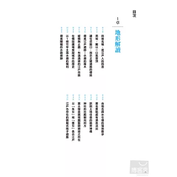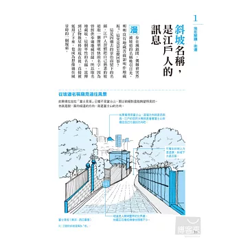 您可曾想過,日本的街道命名方式有其來由?明明沒有地藏菩薩卻叫作地藏坂,這究竟是怎麼回事?建築本身自然是重點,其他也涵蓋了洞窟、湧泉、坡道、暗渠、水路、路面電車、橋下、攤販、標誌等設計剖析。