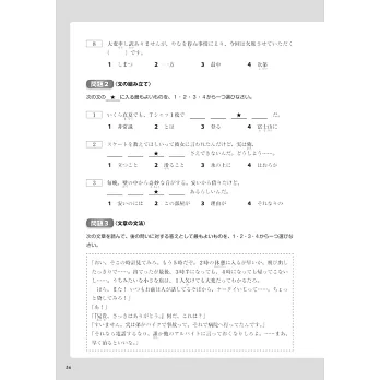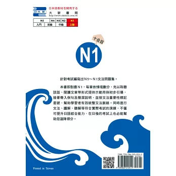 兼具文法、讀解、聽解三大學習重點,透過演練、閱讀、聆聽等學習方式有效提升學習者全方位的日語應用能力。書中的「綜合問題」等應用練習,皆符合實際考試出題形式,學習同時可培養應試實力,輕鬆達陣得分!