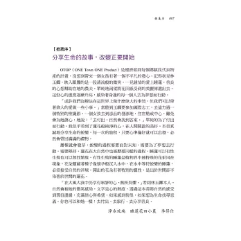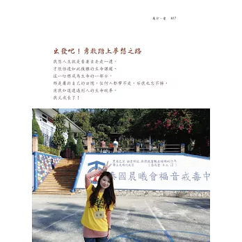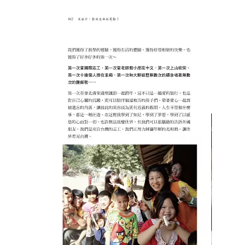 物質會隨著時間折舊,但體驗生活卻會在回憶裡越沉越香,脫掉高跟鞋,換上平底鞋,勇敢出發做自己和別人的天使,盼望著那段生命中預期之外的岔路,所帶來的精采冒險,參與國際志工的公益活動,讓人真正體會愛是無國界,一輩子最棒的旅行,就是在一個陌生的土地上找到失去已久的感動,感覺到自己的生命更加完整。