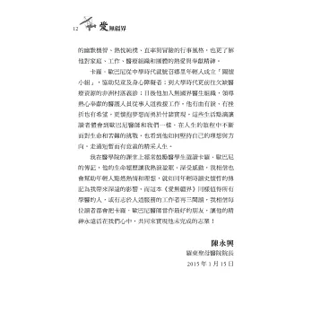 這本書值得所有學醫的人,或有志於人道服務的工作者再三閱讀,我相信能夠幫助年輕人點燃熱情和理想!陳永興(羅東聖母醫院院長)
