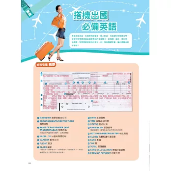為了幫助讀者做好出國旅遊的準備,特別針對搭機出國會遇到的各個關卡,從買機票、劃位、報到、搭機,到入境、領行李、過海關,整理簡單實用的句子,讓你應變自如不害怕!還有實物圖解字彙,教你看懂機票、登機證、機場標示,以及填寫海關申報單。