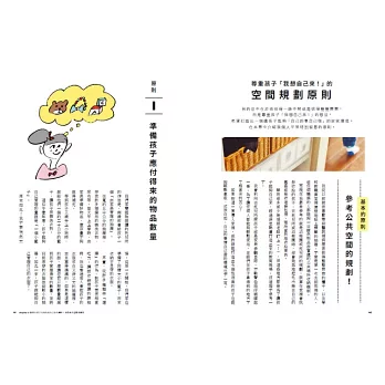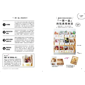 書中有作者親授的24小時的小家庭收納行程、0~5歲孩子的專屬空間道具介紹、15個讓小孩樂於收拾的點子及各種小訣竅與案例分享等豐富內容。只要規劃能夠讓孩子們自己來的空間,就能培養出孩子「自己的事情自己決定的能力」!