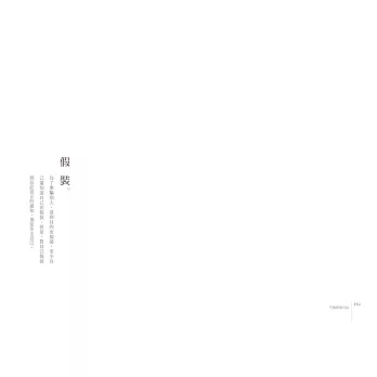 假裝可以是欺瞞,也可以是保護。有所圖而假裝的喜愛,是包藏禍心的糖衣;怕傷人而假裝的婉轉,卻是在利刃外加上的護鞘。沒有絲毫假裝的世界,並不是裡外甜蜜的糖果屋,那裡更該是刀光劍影,落石荊棘,或許還會被自己的倒影驚嚇。─〈情意的裸妝〉