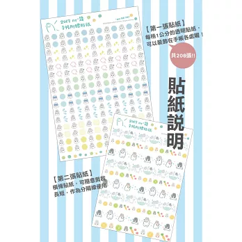 ♦貼紙:無限超值!13x19cm兩張豪華大貼紙,第一張為每格1x1cm的透明小貼紙,便於裝飾在手帳的任何角落。不上白墨的半透明彩色貼紙,可以標記在字裡行間。第二張為橫條貼紙,可隨意剪裁長短,作為分隔線使用。