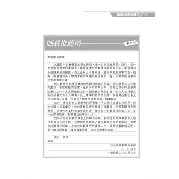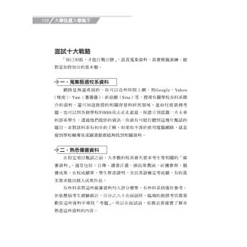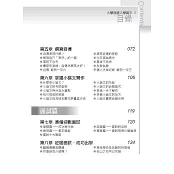 本書除了針對一般甄選入學,羅列從審查資料的師長推薦函、讀書計畫、自傳、小論文的寫作祕訣,到面試的穿著打扮、心情調適、眼神電波、臨場應變、模擬演練,面面俱到。除提供詳細範例與成功者告白,更令人驚喜的是,陳美儒老師還整理了近幾年指導學生的心得,提供豐富的範例、得分祕訣、第一手情報、成功者告白、要點總整理!不管是臨場實況、面試題目、特殊情境、趨勢發展、加分妙招等等,絕對值得參考,讓你一本掌握最新的考情變化與情境預測。