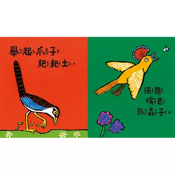 本書是聞名全球的小鼠波波作者露西.卡森的最新創作,色彩鮮豔豐富,加上充滿韻律感的文字,讓孩子扮演不同的鳥兒,一會兒跟著麻雀「跳,跳,跳!」一會兒學啄木鳥「敲,敲,敲!」,還要大聲學鳥兒唱歌!讓孩子跟著輕快的句子,愉快的模仿鳥兒,動動身體也動動腦、發揮創意!