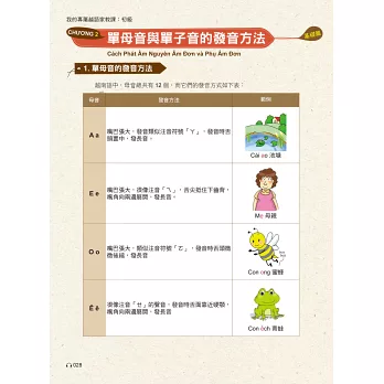 1. 自修課本:本書由二個越南語教學老師親自撰寫及審訂,內容完完全全為台灣學生量身訂做!聽、說、讀、寫、發音一本搞定!從基礎字母、雙母音,到實用字彙以及基礎會話,每一章的最後也都提供練習題,讓學習者邊學邊演練、完整掌握學習進度。