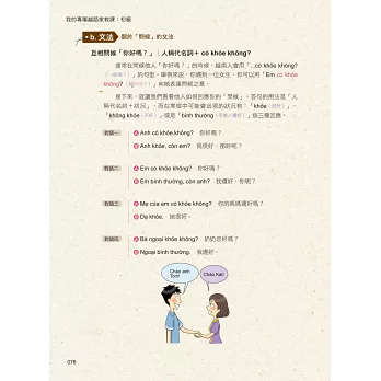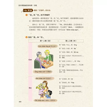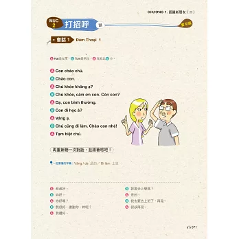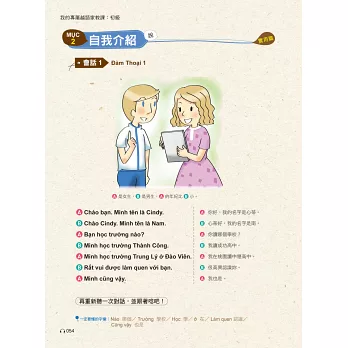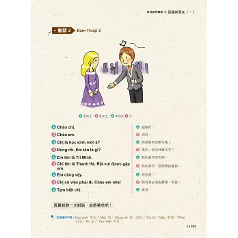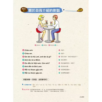 作者依照主題設計會話,大家一起試著唸唸看。要是還沒學會怎麼唸也無妨,本書特邀越籍老師放慢語速錄製會話MP3,同時善用播放軟體的暫停/播放鍵,就可以順利地跟著一起唸啦!