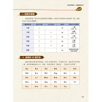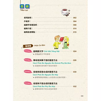 學習越語就要紮實地從29個基礎字母(12個母音、17個子音)發音開始,接著是各類實用單字,最後學各種在生活中常用的句型。使用清楚表格的整理方式,讓你在學習越語最基礎、最無聊的文法課程時,也能快速學會、學好!